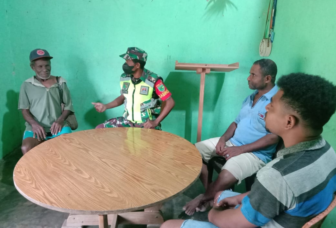 Biak Utara – Babinsa Koramil 1708-02/Biak Utara, Sertu Firman Duwila melaksanakan anjangsana dirumah Bapak Rudi Anis di Kampung Warbinsi, Distrik Andey, Kabupaten Biak Numfor, Papua, Minggu 08 Mei 2022.