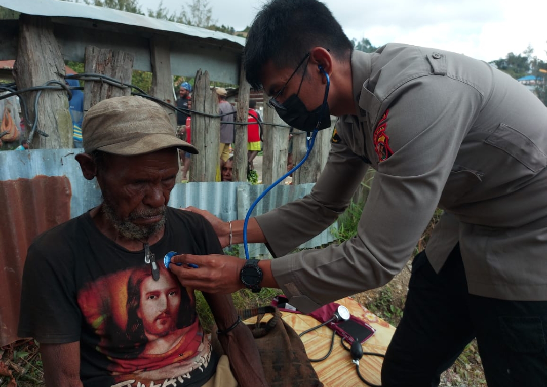 Jayapura – Dalam memberikan Pelayanan Kesehatan di wilayah Pedalaman Papua, Polri Melalui Tim Medis Satgas Binmas Noken Ops Damai Cartenz berikan layanan kesehatan secara gratis di Kabupaten Intan Jaya dengan Program Keladi Sagu.