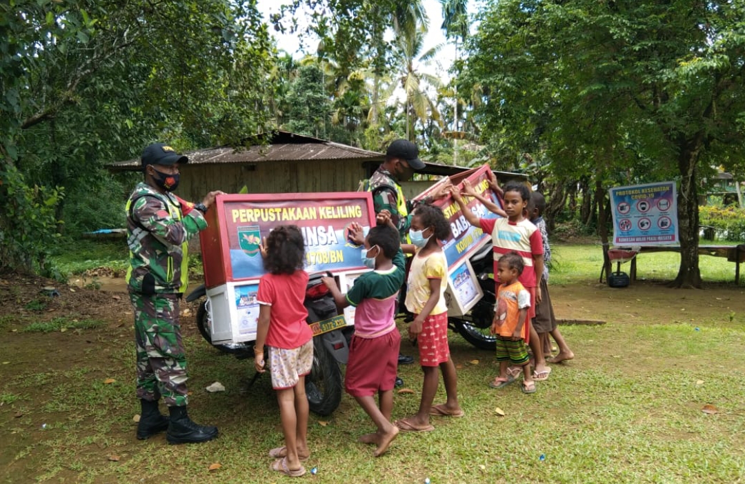 Biak – Babinsa Koramil 1708-03/BB Sertu Filipe Marandof dan Praka Elisa Kapisa melakukan inovasi dalam pemberdayaan kemanunggalan TNI dengan rakyat, salah satunya melalui perpustakaan keliling sebagai Sarana Interaksi dan Komunikasi Sosial (SI-KOMOS) di wilayah binaan di Kampung Andey Distrik Biak Barat, Kabupaten Biak Numfor, Papua, Sabtu 14 Mei 2022.