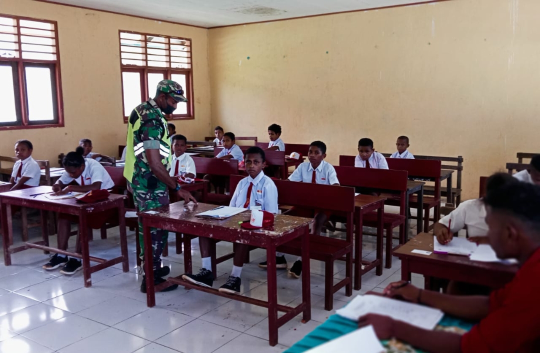Numfor – Babinsa Koramil 1708-05/Numfor Serda Ferdinan Kmur ikut membantu mengawasi dan pemantauan ujian tingkat SD dilaksanakan di SD YPK Ulim Dafi di Kampung Dafi, Distrik Bruyadori, Kabupaten Biak Numfor, Papua, Sabtu 14 Mei 2022.