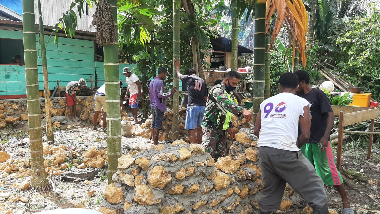 Supiori – Babinsa Koramil 1708-06/SU Serda Ali Ramli Bugis Bergotong-royong bersama Warga kampung membuat pondasi rumah Bapak Agustinus di Kampung Syurdori, Distrik Supiori Timur, Kabupaten Supiori, Papua, Senin 16 Mei 2022.