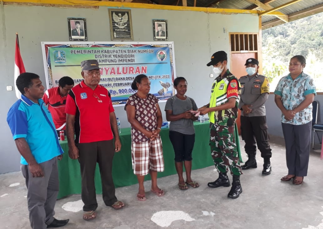 Biak – Babinsa Koramil 1708-01/Biak Kota Kopda Khoirul Mutakhin memonitoring kegiatan penyaluran Bantuan Langsung Tunai Dana Desa (BLT DD) Tahap 1 Tahun Anggaran 2022, di Balai Kampung Impendi, Distrik Yendidori Kabupaten Biak Numfor, Papua, Selasa 17 Mei 2022.