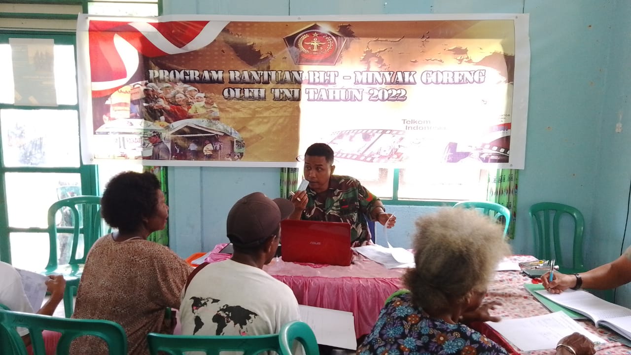Supiori – Kodim 1708/BN Gelar penyaluran bantuan langsung tunai (BLT) minyak goreng (Migor) kepada keluarga penerima manfaat di Kantor Kampung Sorendiweri, Distrik Supiori Timur, Kabupaten Supiori, Papua Rabu 18 Mei 2022m