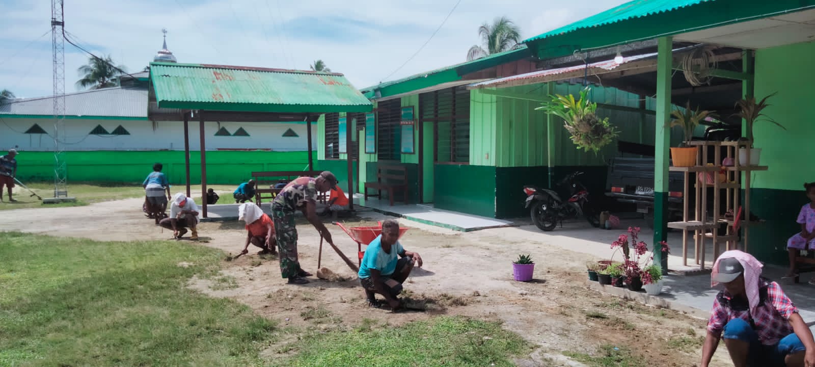 Numfor – Demi terus menciptakan suasanan Kantor yang nyaman, asri serta lingkungan kerja yang indah, anggota Koramil 1708-05/Numfor lakukan pembersihan pangkalan di bantu oleh masyarakat sekitar dengan membersihkan halaman kantor seluruh bangunan dan pagar yang berada di Kantor Koramil 1708-05)Numfor, Kampung Yemburwo, Distrik Numfor Timur, Kabupaten Biak Numfor, Papua, Kamis 19 Mei 2022.
