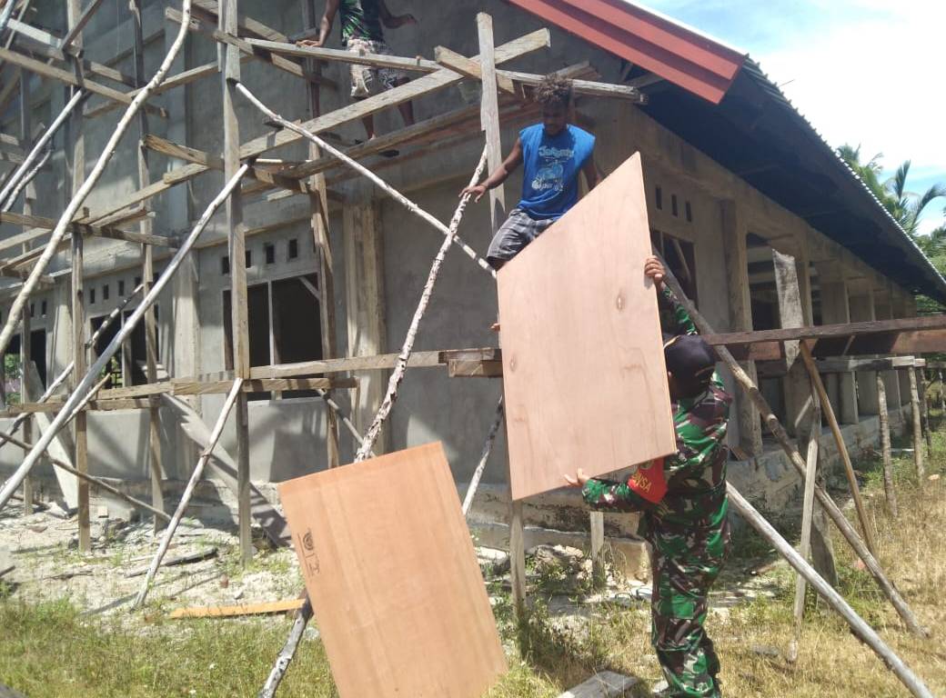 Supiori – Babinsa Koramil 1708-06/Supiori Utara, Sertu A. Ganna Kadang membantu warga dalam pekerjaan pemasangan Plafon Gereja Agape Yenggarbun, Supiori Utara, Kabupaten Supiori, Papua, Sabtu, 21 Mei 2022.