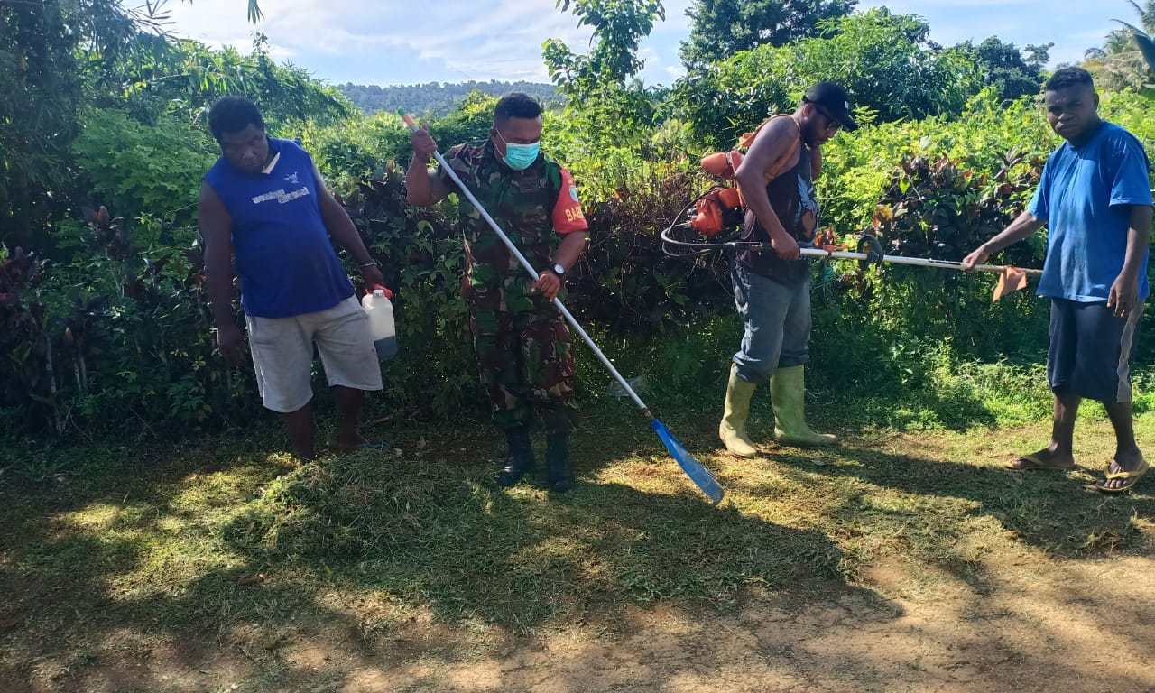 Biak Utara – Babinsa Koramil 1708-02/BU, Serda Dedi Kamok Membantu masyarakat dalam hal ini Pembesihan rumput liar sepanjang jalan di Kampung Saukobye, Distrik Biak Utara, Kabupaten Biak Numfor, Papua, Kamis 26 Mei 2022.