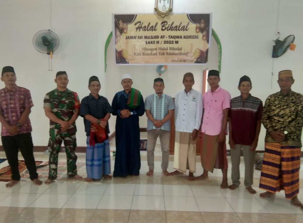 Biak Utara – Babinsa Koramil 1708-02/Biak Utara Sertu Suhardin melaksanakan kegiatan ibadah Sholat Jum’at bersama warga, dilanjutkan acara Halal Bihalal, di Masjid At-Taqwa di Kampung Korem, Distrik Biak Utara, Kabupaten Biak Numfor, Papua, Jum’at 27 Mei 2022.
