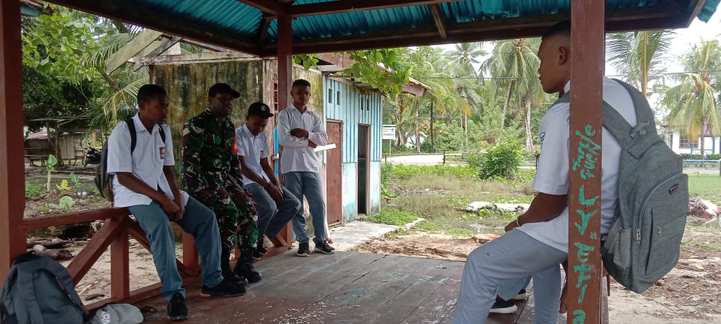 Supiori – Babinsa Sertu Edwin Elly memberikan motivasi tentang pentingnya pendidikan kepada pelajar di SMA N 3 Desa Yenggarbun, Distrik Supiori Utara, Kabupaten Supiori, Papua, Sabtu 28 Mei 2022.