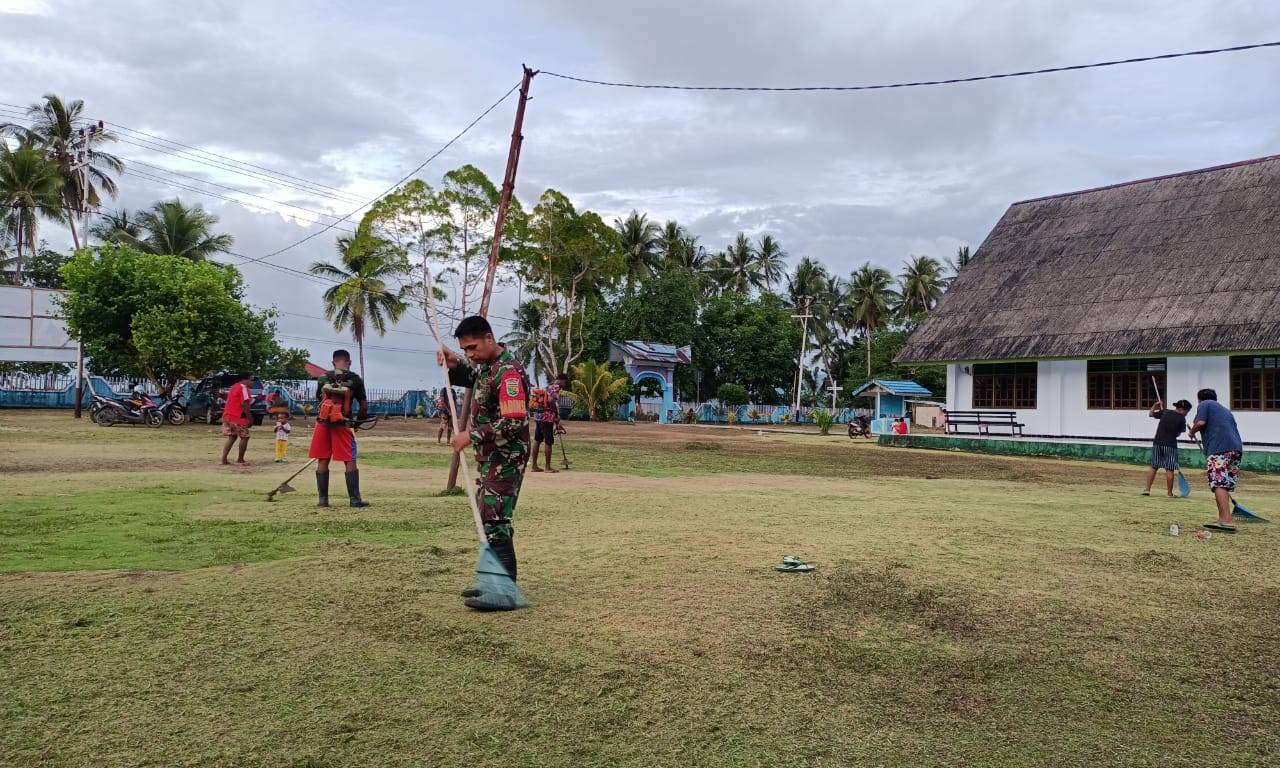 Supiori – Babinsa Koramil 1708-06/Supiori Utara Sertu Yan Pasiga melaksanakan kegiatan karya bakti bersama dengan warga membersihkan halaman gereja GKI Diaspora, di Kampung Sorendiweri, Distrik Supiori Timur, Kabupaten Supiori, Papua, Minggu 29 Mei 2022.