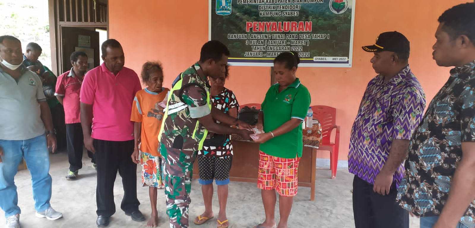 Biak – Guna memberikan rasa aman pada saat pembagian Bantuan Langsung Tunai (BLT), Babinsa Koramil 1708-01/Biak Kota Serda Andarias Pariaribo mendampingi kegiatan penyaluran BLT Tahap 1 Tahun 2022 Kampung Syabes, Distrik Yendidori, Kabupaten Biak Numfor, Papua, Senin 30 Mei 2022.