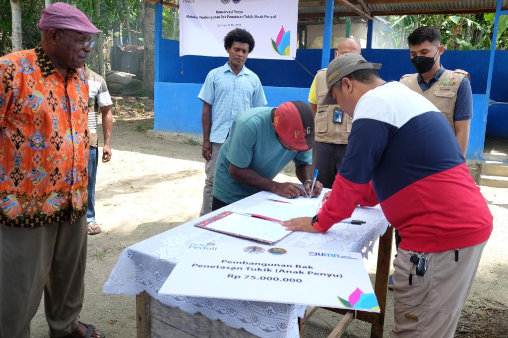 Acara tersebut diakhiri dengan penandatanganan berita acara serah terima bantuan serta dilanjutkan dengan pelepasliaran tukik di sekitar pesisir pantai. Pelepasliaran tukik pun diawali dengan doa yang dipimpin oleh tokoh adat Kampung Yewena. (HUMAS PLN)