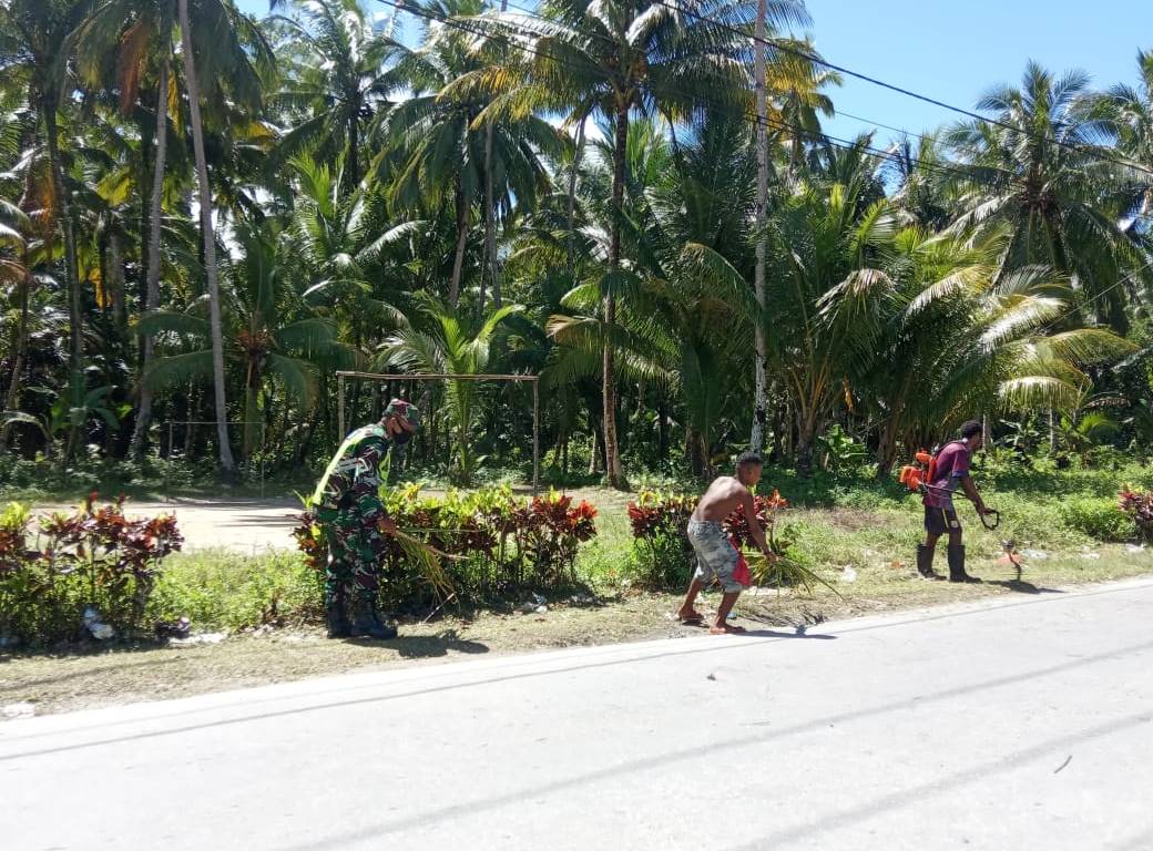 Biak Timur – Babinsa Posramil 1708-01/Biak Timur Sertu Ferdison Wanmafma membantu warga kerja bhakti membersihkan rumput yang tumbuh di bahu jalan di Kampung Adorbari, Distrik Biak Timur, Kabupaten Biak Numfor, Papua, Minggu 05 Juni 2022.