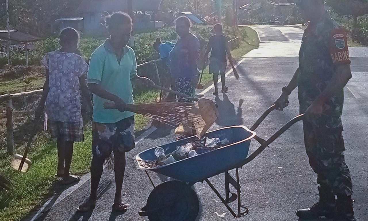 Supiori – Babinsa Koramil 1708-06 Supiori Utara Praka Arthur Sanoy Bantu mama-mama dalam pembersihan atau menyapu sampah yang berserakan disepanjang jalan jalan Kampung Warbor, Distrik Supiori Utara, Kabupaten Supiori, Papua, Selasa 07 Juni 2022.