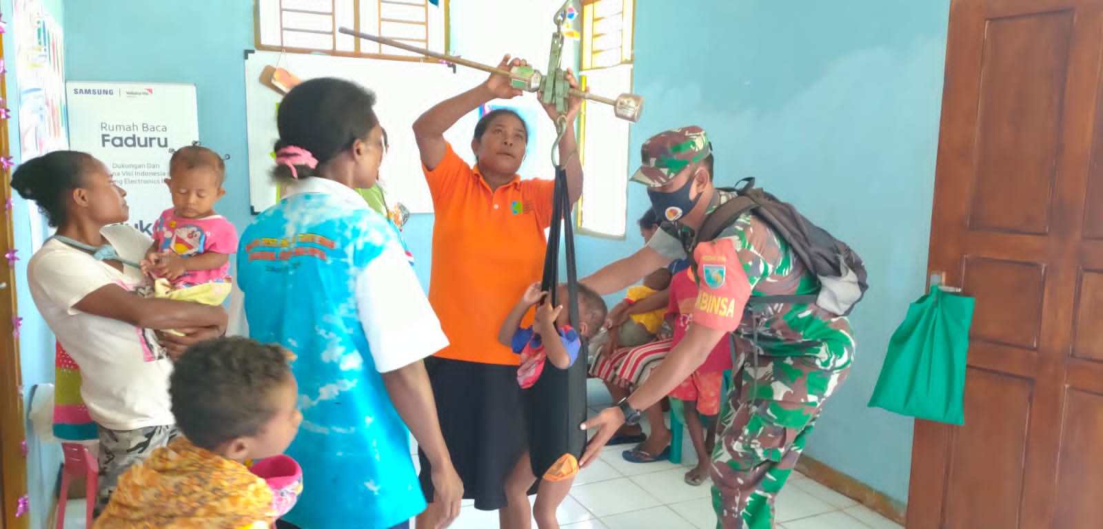 Biak – Sertu Teguh S Babinsa Koramil 1708-02/Biak Utara mendampingi jalannya program Posyandu di Kampung Binaan, Kampung Dernafi, Distrik Biak Utara, Kabupaten Biak Numfor, Papua, Kamis 09 Juni 2022.