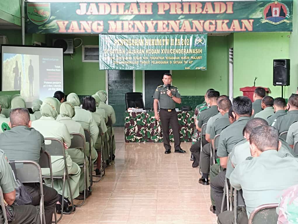 Penyuluhan ini disampaikan oleh Waka Kumdam XVII/Cenderawasih Letkol CHK Susilo SH, MH dan Kapten CHK Modal Sembiring, SH selaku Kaurperslog Kumdam XVII/Cenderawasih di aula Makodim 1708/BN, Distrik Samofa, Kabupaten Biak Numfor, Papua, Kami 09 Juni 2022.