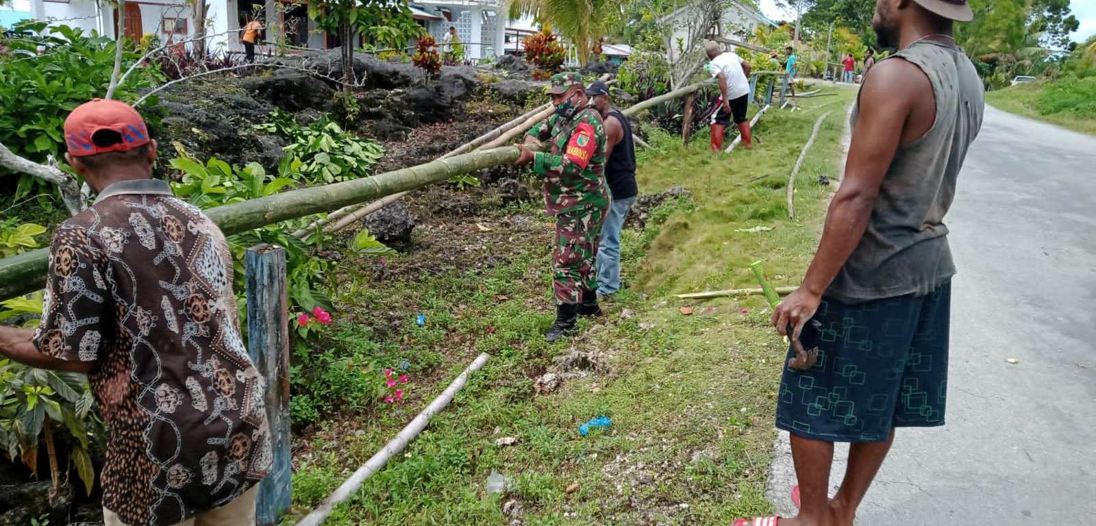 Biak Timur – Sebagai wujud kebersamaan dengan rakyat Babinsa Posramil 1708-01/Biak Timur Sertu Dodik Warbal bantu masyarakat dalam proses pembuatan pagar sepanjang Jalan Kampung Woniki, Distrik Biak Timur, Kabupaten Biak Numfor, Papua, Jum’at 10 Juni 2022.