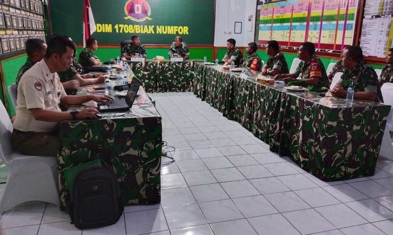 Biak – Komandan Kodim 1708/BN Letkol Inf J. Daniel P. Manalu., S.H. M.I. Pol bersama Perwira Staf dan Danramil menerima kunjungan Tim Itjen TNI Uji Petik BTPKLWN dan Bantuan Tunai Minyak Goreng yang bertempat di ruang data Makodim 1708/BN, Distrik Samofa, Kabupaten Biak Numfor, Papua, Jum’at 10 Juni 2022.