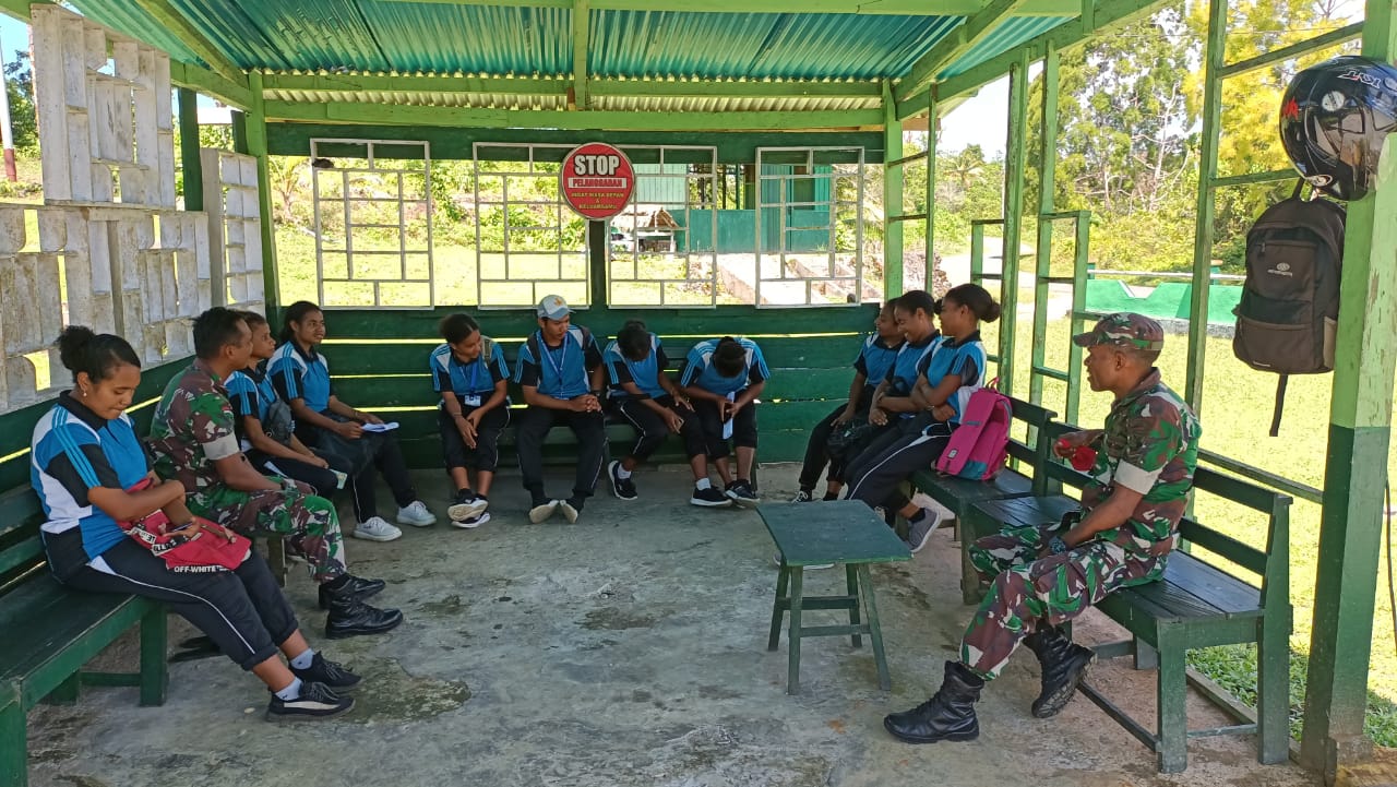Biak – Babinsa Koramil 1708-02/Biak Utara Serka Daniel Kafiar dan Serda Sukri Goma melaksanakan komunikasi sosial (Komsos) dengan pelajar SMA 1 Biak Utara, di Kampung Andey, Distrik Biak Utara, Kabupaten Biak Numfor, Papua, Senin 13 Juni 2022.