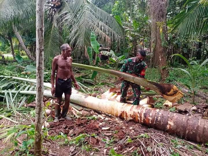 Warsa – Memupuk kebersamaan dan keharmonisan bersama masyarakat, Sertu Melkianus Nap Babinsa Posramil 1708-02/Bu-Warsa melaksanakan komunikasi sosial dengan membantu secara langsung proses pengolahan sagu milik Markus Brabar di Kampung Karmon, Distrik Yawosi, Kabupaten Biak Numfor, Papua, Selasa 14 Juni 2022.