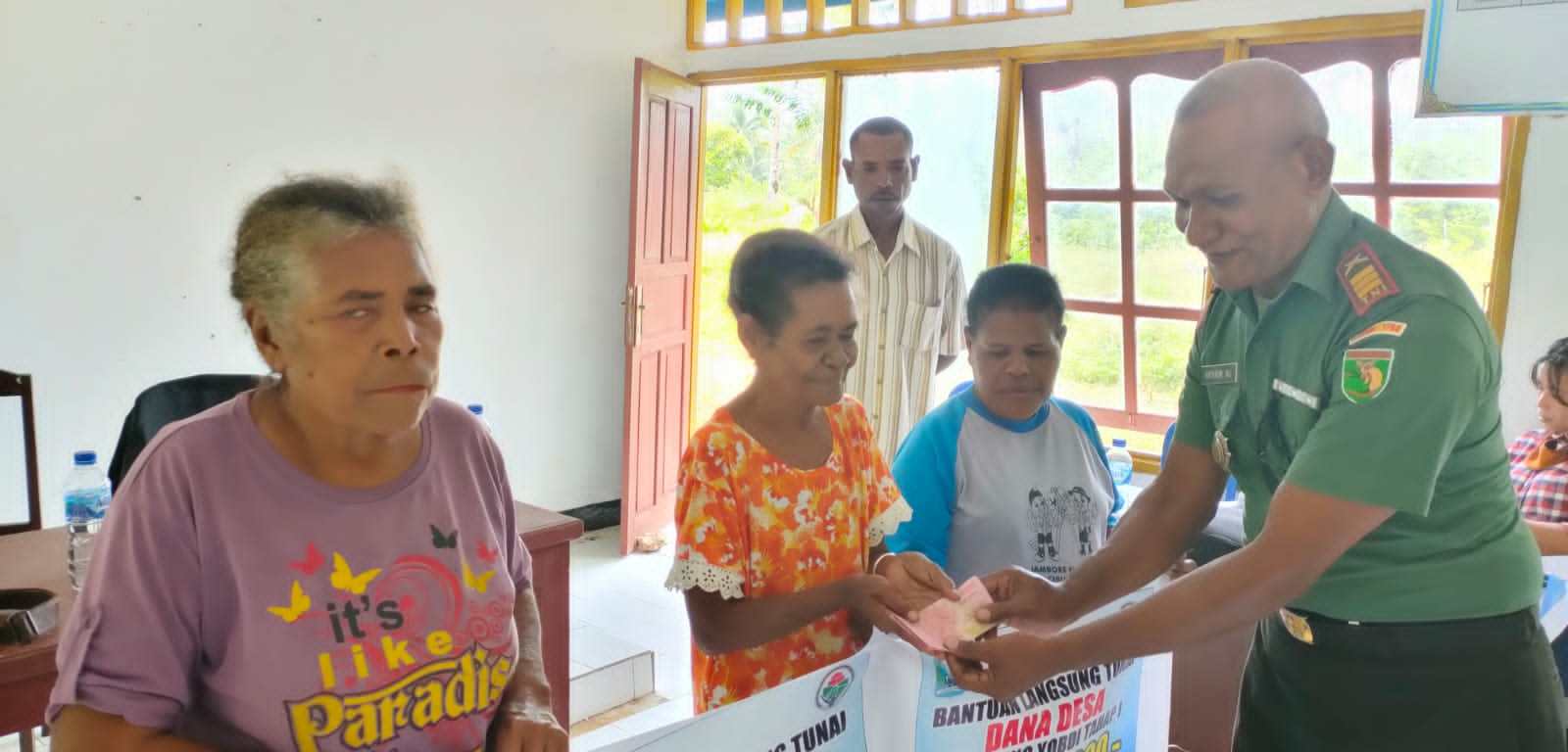 Biak – Danramil 1708-02/BU Kapten Inf Anthon Asyerem beserta Babinsa Kampung Yobdi Sertu Teguh Santoso melaksanakan kegiatan pendampingan pembayaran Bantuan Langsung Tunai (BLT) Triwulan I Dana Desa bulan Januari, Februari, Maret Tahun 2022 dengan total penerima per orang sebesar Rp900.000,-/3 bulan, dengan total penerima BLT sebanyak 88 jiwa di Kampung Yobdi, Distrik Biak Utara, Kabupaten Biak Numfor, Papua, Kamis, 16 Juni 2022.