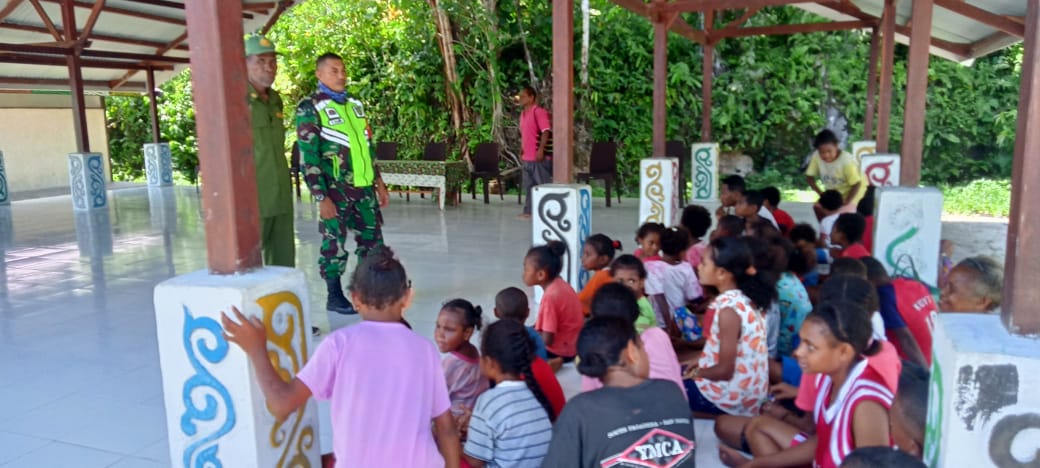 Biak – Babinsa Posramil 1708-01/Biak Timur Sertu M. Yamin menjalin silaturahmi dan komunikasi sosial (Komsos) dengan masyarakat di areal wisata Pantai Anggopi, Kampung Anggopi, Distrik Biak Timur, Kabupaten Biak Numfor, Papua, Jum’at 17 Juni 2022.