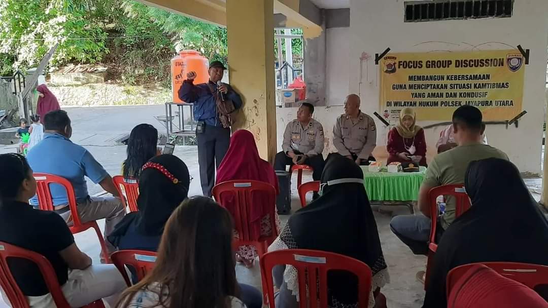 FGD yang digelar mengangkat Tema, “Membangun Kebersamaan Guna Terciptanya Situasi Kamtibmas yang Aman dan Kondusif di Wilayah Hukum Polsek Jayapura Utara” dan dipimpin langsung Wakapolsek Jayapura Utara Iptu Miftachul Ulum didampingi Kanit Binmas Ipda Marno bersama Bhabinkamtibmas setempat Aipda Yanes.