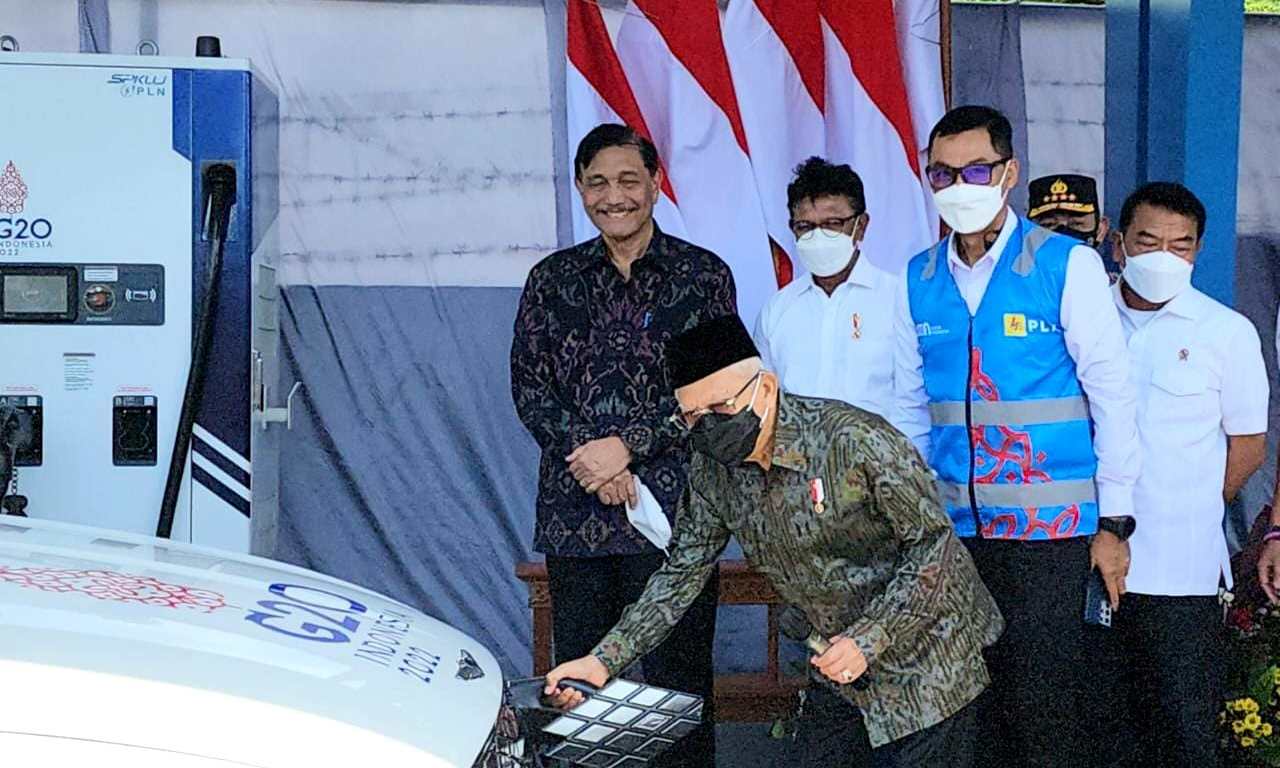 SENTANINEWS.ID -Nusa Dua – Wakil Presiden Republik Indonesia K. H. Ma’ruf Amin didampingi Menteri Koordinator Bidang Kemaritiman dan Investasi Luhut Binsar Pandjaitan bersama Direktur Utama PLN Darmawan Prasodjo meninjau langsung kesiapan Stasiun Pengisian Kendaraan Listrik Umum (SPKLU) di Nusa Dua, Bali, Selasa (30/8). SPKLU ini disediakan untuk menyambut puncak acara Presidensi G20 yang digelar pada November mendatang.