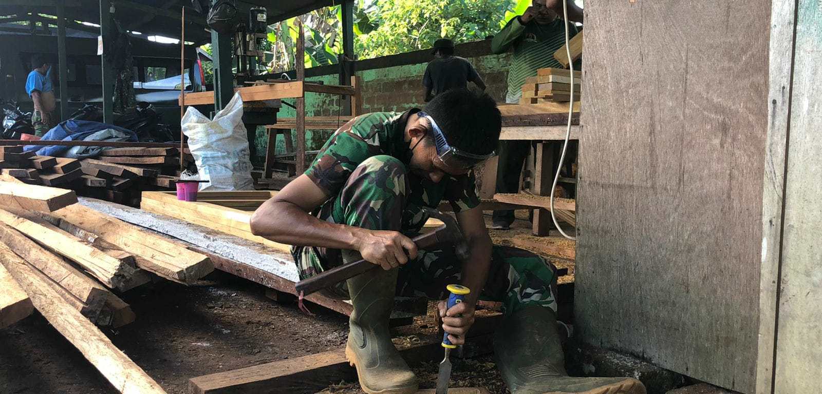 Terlihat begitu antusias dan penuh semangat anggota Kodim 1708/BN yang juga merupakan Satgas TMMD saat pembuatan kusen jendela dan pintu.