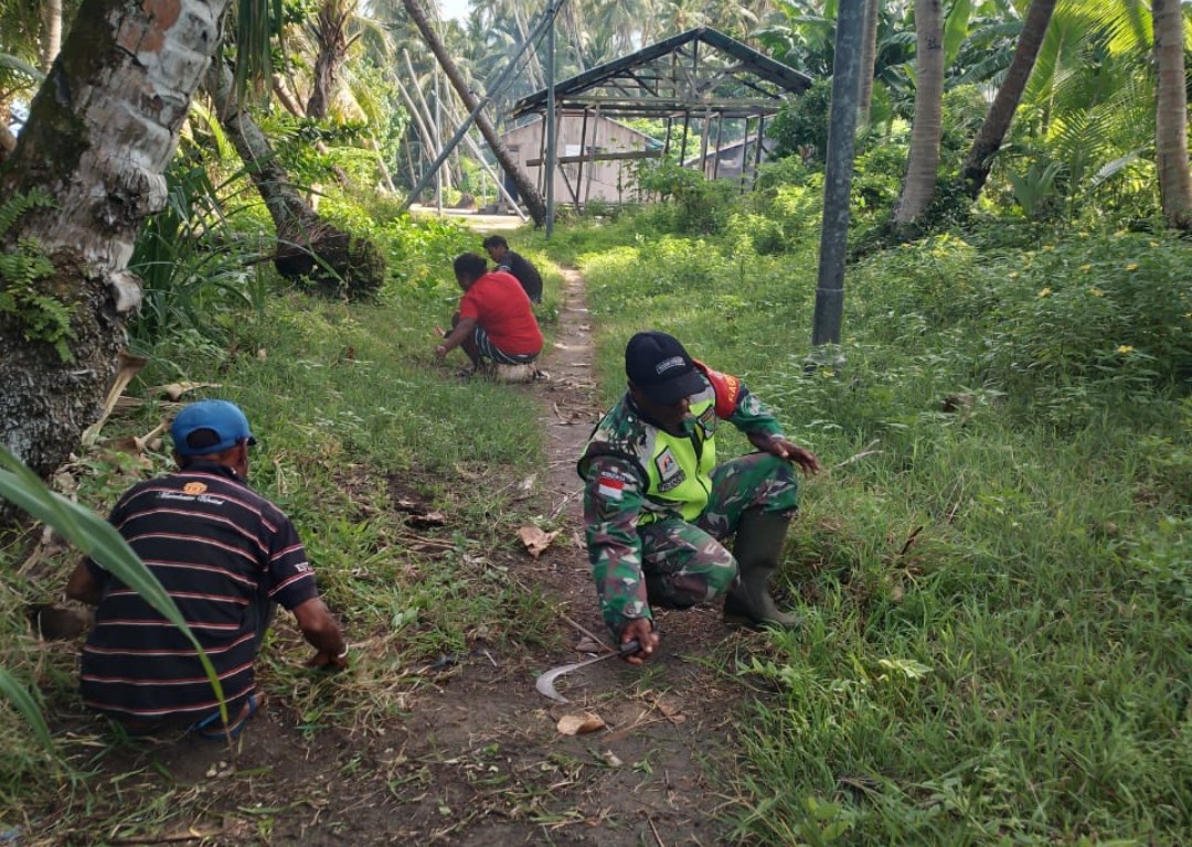 Babinsa bersama-sama dengan warga binaan dengan semangat melaksanakan pembersihan rumput dan dedaunan di sepanjang jalan. Pekerjaan yang dilakukan dengan sistem bergotong royong sangat penting untuk tetap dibudayakan di tengah-tengah masyarakat.
