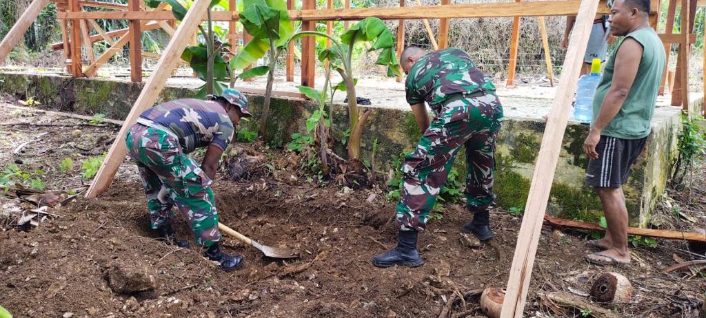 Tampak anggota Satgas TMMD bersama para tukang bangunan warga setempat, bekerja untuk membuat bangunan MCK dan juga septic tank.