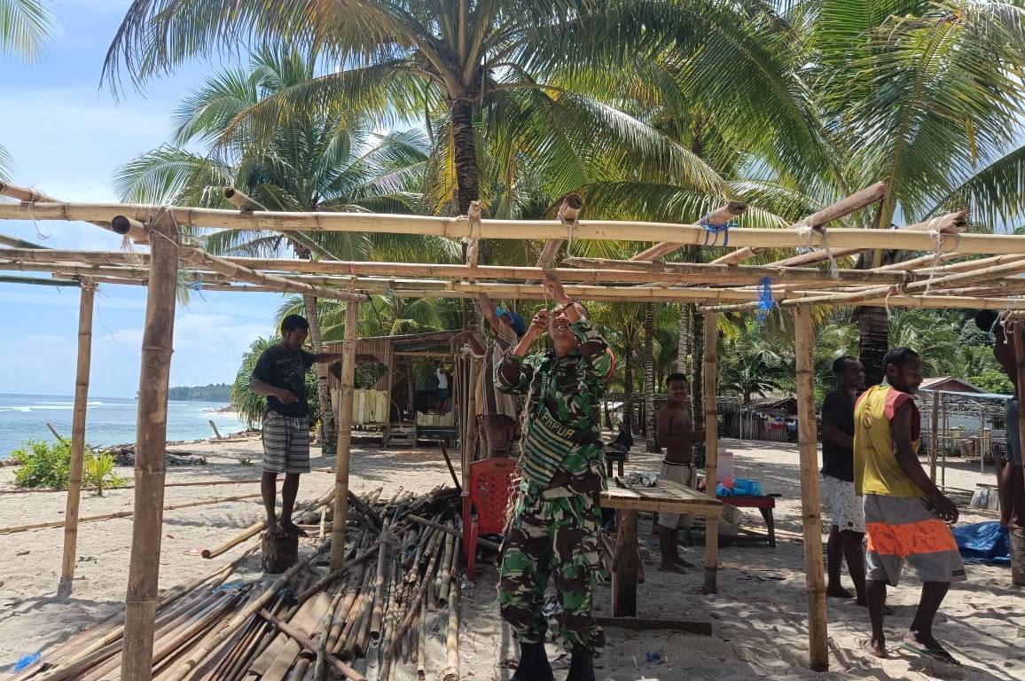 SENTANINEWS.ID – Warsa – Babinsa Posramil 1708-02/BU-Warsa, Sertu Abdullah kerja bakti bersama masyarakat binaannya dengan membantu memasang kerangka tenda kayu yang akan dipergunakan dalam kegiatan pasar malam, di Kampung Marur, Distrik Warsa, Kabupaten Biak Numfor Minggu, Papua, 23 Oktober 2022.