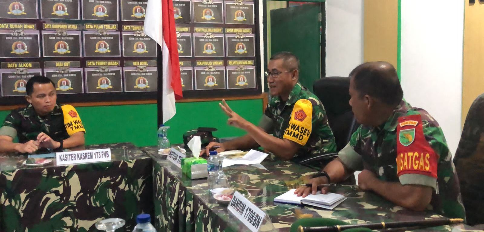 SENTANINEWS.ID – Biak – Tim Pengawas dan Evaluasi (Wasev) Mabesad yang diketuai oleh Kolonel Inf Erwin Rusti Awan S.Sos Paban Sahli Kasad Bid. Was Afrika dan Timteng, dan Mayor Inf Aflahal Mukmin, S.E. Pabanda Laksopsbak Spaban V/Bakti TNI Strerad melakukan evaluasi program TNI Manunggal Membangun Desa (TMMD) ke-115 Kodim 1708/BN, bertempat di ruang data Kodim 1708/BN, Jalan Sriwijaya, Kelurahan Brambaken, Distrik Samofa, Kabupaten Biak Numfor, Papua, Senin 24 Oktober 2022.
