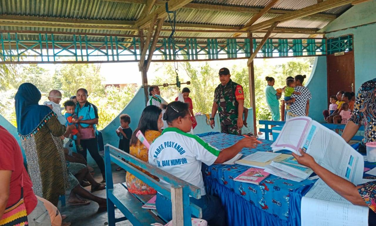 SENTANINEWS.ID – Biak – Babinsa Koramil 1708-01/Biak Kota Sertu Sukiman ikut serta mendampingi kegiatan Posyandu balita yang di laksanakan di Desa Binaannya yaitu Kampung Darfuar, Distrik Samofa, Kabupaten Biak Numfor, Papua, Selasa 25 Oktober 2022.
