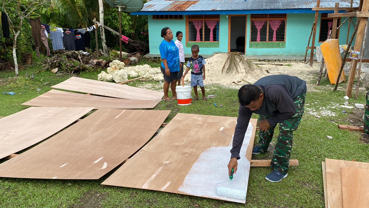 SENTANINEWS.ID – Biak – Sebelum melaksanakan pemasangan plafon, Satgas TMMD Kodim 1708/BN terlebih dahulu melaksanakan pengecatan triplek guna mempermudah pekerjaan, di Kampung Sorido, Distrik Biak Kota, Kabupaten Biak Numfor, Papua, Selasa 25 Oktober 2022.