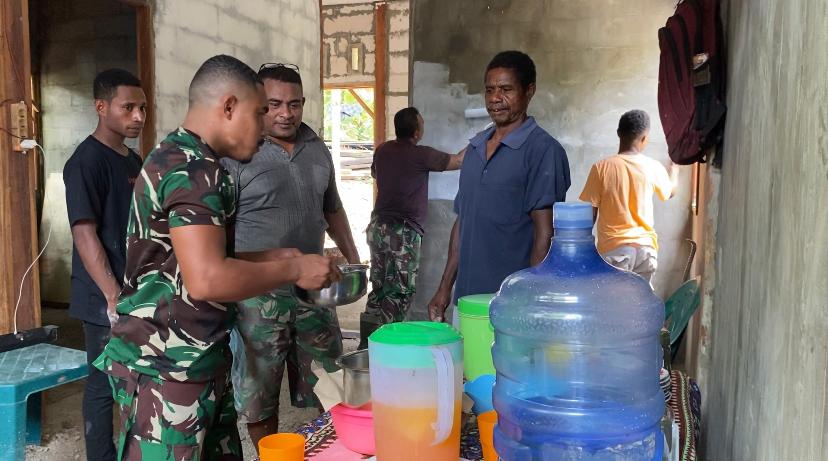 Kecerian terlihat saat personil Satgas TMMD Ke-115 Kodim 1708/BN sedang menikmati makan siang di rumah Bapak Franky Korwa.