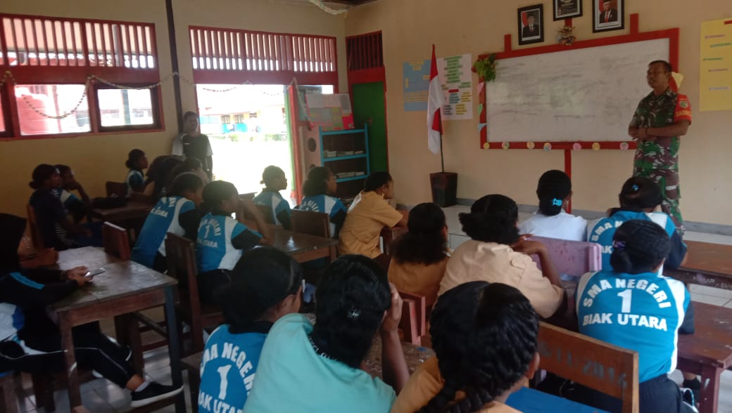 Para pelajar SMA N 1 Biak Utara sangat berantusias dalam mengikuti materi yang diberikan oleh Babinsa. Dalam kegiatan tersebut Babinsa membuka sesi tanya jawab serta sharing kepada pelajar.