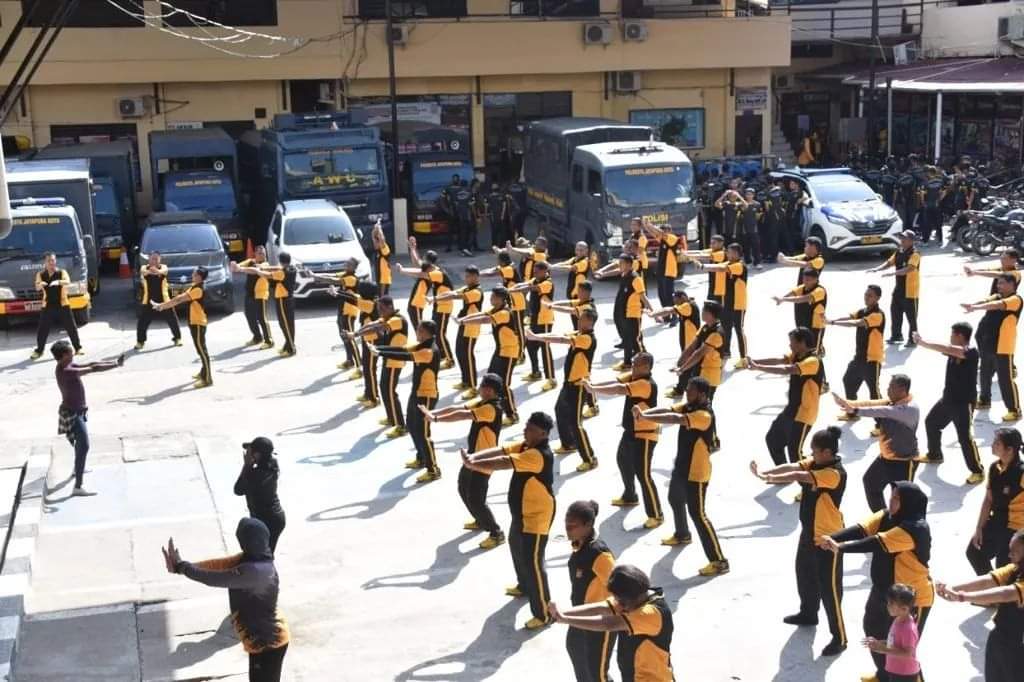 Giat olahraga bersama dipimpin pelatih senam aerobik yang diundang dan diikuti oleh para pejabat utama dan personel Polresta Jayapura Kota.