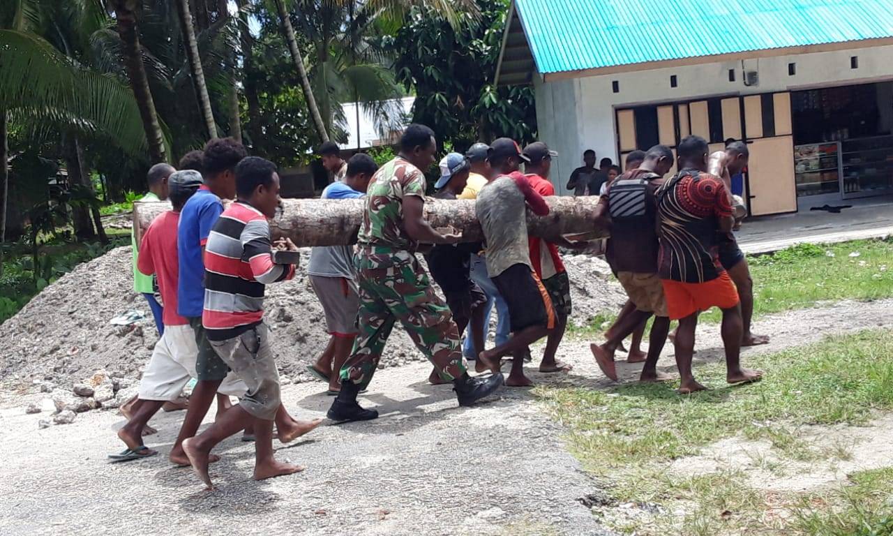 “Inilah salah satu bentuk kemanunggalan TNI dan Rakyat dalam bentuk gotong royong dengan sasaran kegiatan pembangunan jembatan darurat dari batang kelapa yang mana jalan tersebut menghubungkan antara Kampung Maniri ke arah Pasar Warsa,” kata Sertu Paulus.