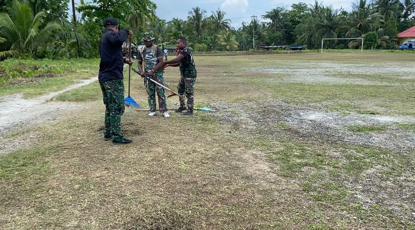 Terlihat para anggota Satgas TMMD membersihkan lapangan bola Sorido yang nantinya akan di gunakan sebagai lokasi upacara penutupan TMMD Ke-115 Kodim 1708/BN pada tanggal 09 November 2022 mendatang.