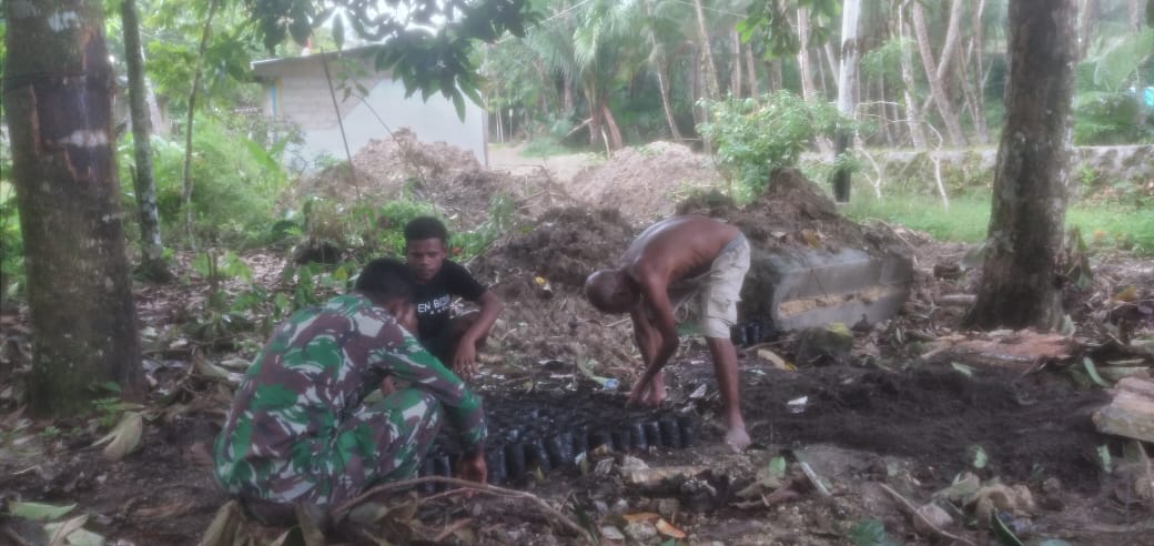 SENTANINEWS.ID – Warsa – Babinsa Koramil 1708-02/BU-Warsa Sertu Melkianus Nap terlihat sedang membantu warga melakukan penyemaian bibit cabai rawit milik Bapak Nataniel Arfusau dalam polybag, di Kampung Imbari, Distrik Warsa, Kabupaten Biak Numfor, Papua, Sabtu 12 November 2022.