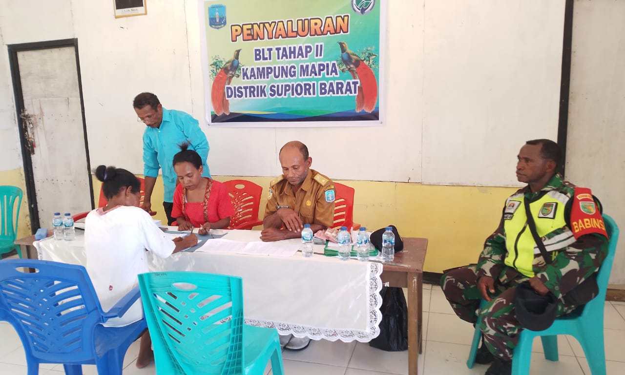 SENTANINEWS.ID – Supiori – Babinsa Koramil 1708-06/SU Serka Frans Buinei bersama Babinkamtibmas Bribka Kelliopas Ronsumbre mendampingi Kepala Kampung Kepulauan Mapia Cendra Msen bersama aparat kampung lainnya membagikan BLT tahap ll kepada masyarakat Kepulauan Mapia di Balai Kampung Mapia, Distrik Supiori Barat, Kabupaten Supiori, Papua, Minggu 13 November 2022.