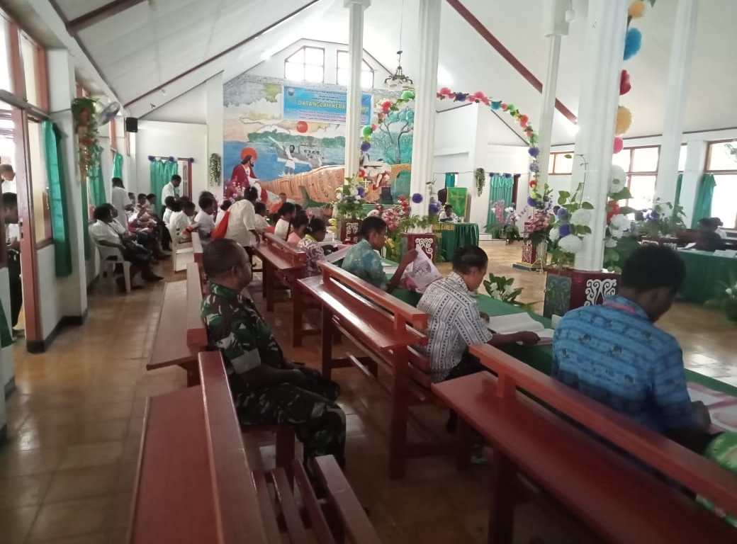SENTANINEWS.ID – Numfor – Babinsa 1708-05/Numfor, Sertu Ronal Wambrauw menghadiri persidangan Ke-XXVII Jemaat GKI Betheil Yemburwo yang berlangsung di Gedung Gereja Bethenia Kampung Kameri, Distrik Numfor Barat, Kabupaten Biak Numfor, Papua, Minggu 13 November 2022.