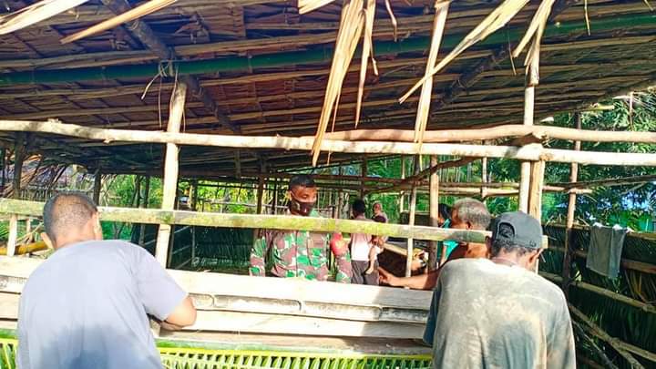 SENTANINEWS.ID – Warsa – Jelang persiapan pengantaran acara adat antar mas kawin di wilayah binaan, Babinsa Posramil 1708-02/BU-Warsa Sertu Melkianus Nap membantu kesiapan pengerjaan tempat masak dan tempat acara terima barang adat dari pihak keluarga laki-laki yang bertempat di Kampung Indawi, Distrik Warsa, Kabupaten Biak Numfor, Papua, Senin 14 November 2022.