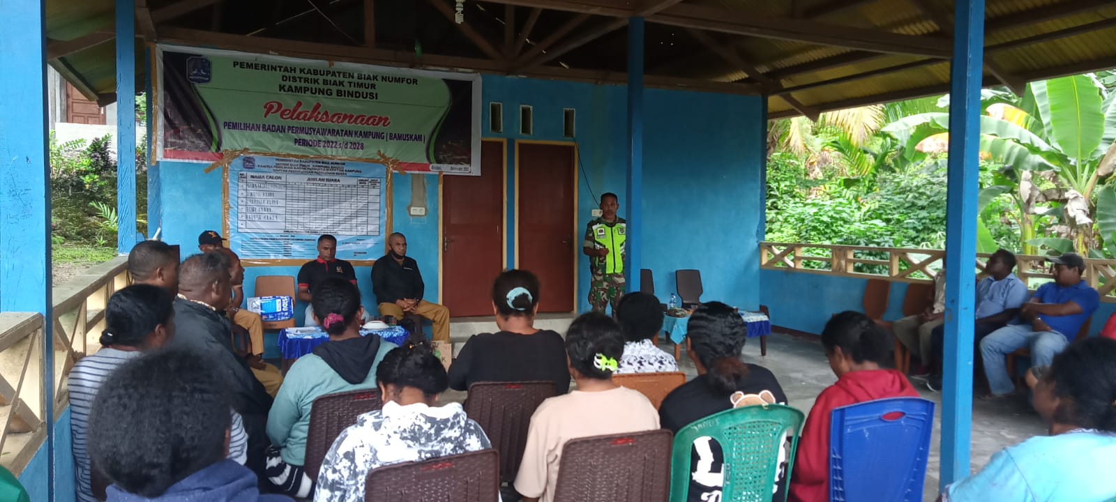 SENTANINEWS.ID – Biak Timur – Babinsa Posramil 1708-01/Biak Timur Sertu M. Yamin dan Sertu Reynold A. J Rumpaisum melaksanakan monitoring pemilihan Badan Permusyawaratan Kampung (Bamuskam) Bindusi periode 2022- 2028 di Balai Kampung Bindusi, Distrik Biak Timur, Kabupaten Biak Numfor, Papua, Selasa 15 November 2022.