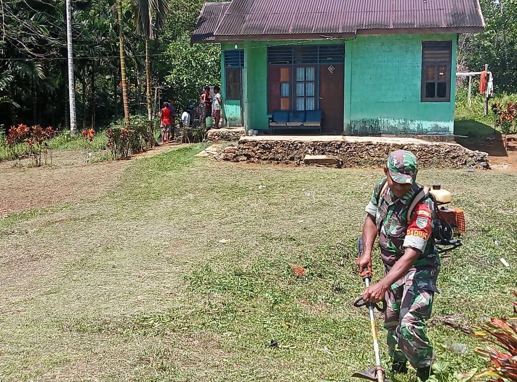 “Melihat kondisi halaman rumah yang ditumbuhi rumput tinggi, membuat pemandangan sekitar jalan masuk ke rumah terlihat kotor dan kurang pelihara kebersihannya, sehingga mendorong saya selaku Babinsa untuk ikut membantu dalam membersihkan rumput yang ada di depan halaman rumah,” kata Serda Andi.