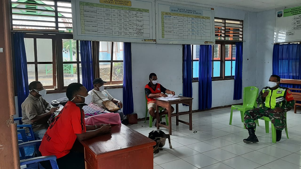 SENTANINEWS.ID – Supiori – Babinsa koramil 1708-06/SU Sertu Agustinus Rumbarar melaksanakan komunikasi sosial (Komsos) bersama perangkat kampung bertujuan untuk meningkatkan kerja guna menciptakan keakraban kerukunan dan keamanan di lingkungan Kampung Waryesi, Distrik Supiori, Kabupaten Supiori, Papua, Jumat 25 November 2022.