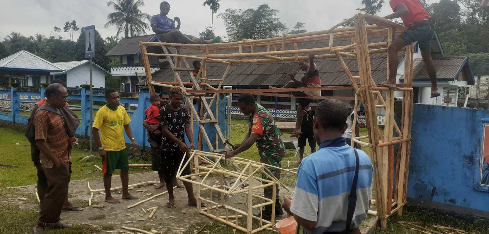 SENTANINEWS.ID – Biak – Babinsa Koramil 1708-01/Biak Kota Serda Andarias Pariaribo bergotong- royong bersama warga jemaat gereja GKI Firdaus Syabes dalam pembuatan gapura Gereja dan pembuatan pondok Natal, di Kampung Syabes, Distrik Yendidori, Kabupaten Biak Numfor, Papua, Kamis 08 Desember 2022.