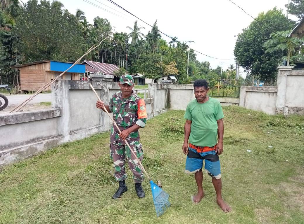 SENTANINEWS.ID – Swandiwe – Babinsa Koramil 1708-03/Biak Barat (BB) Serda Andi Orisu bantu masyarakat dalam hal ini pembersihan halaman gereja Gereja GKI Elim Sarwa, Distrik Swandiwe, Kabupaten Biak Numfor, Papua, Sabtu 10 Desember 2022.