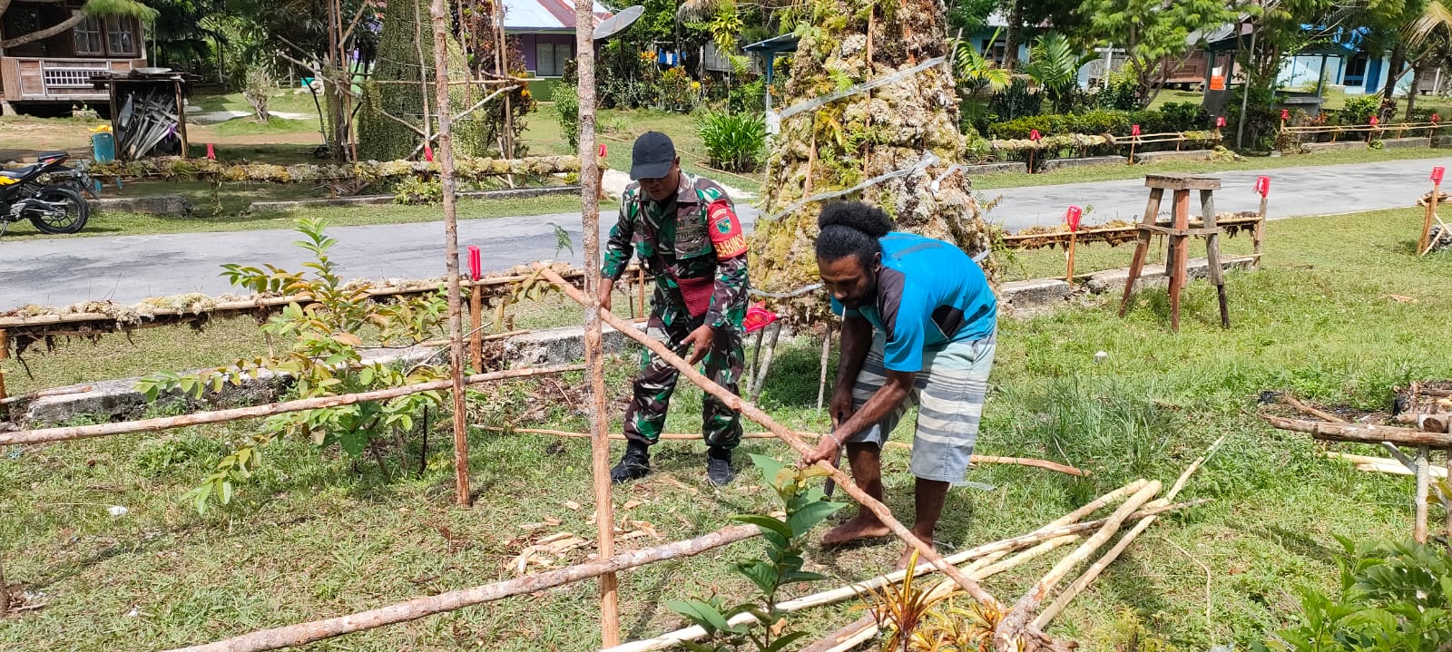 SENTANINEWS.ID – Biak Timur – Babinsa Posramil 1708-01/Biak Timur Sertu Petrus Ikanubun membantu warga binaan membuat pondok Natal di Kampung Insumarires, Distrik Biak Timur, Kabupaten Biak Numfor, Papua, Sabtu 10 Desember 2022.