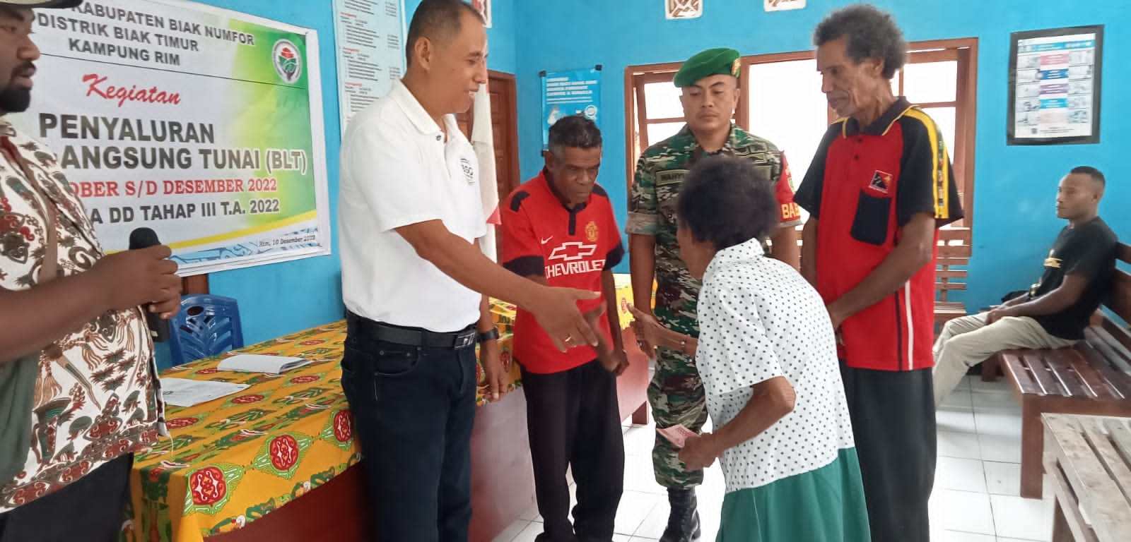 SENTANINEWS.ID – Biak Timur- Bertempat di Balai Kampung Rim, Babinsa Posramil 1708-01/Biak Timur Sertu Wahyu Hendro Patrias Setiawan melaksanakan pendampingan penyaluran Bantuan Langsung Tunai (BLT) DD Bulan Oktober- Desember 2022 di Kampung Rim, Distrik Biak Timur, Kabupaten Biak Numfor, Papua, Minggu 11 Desember 2022.